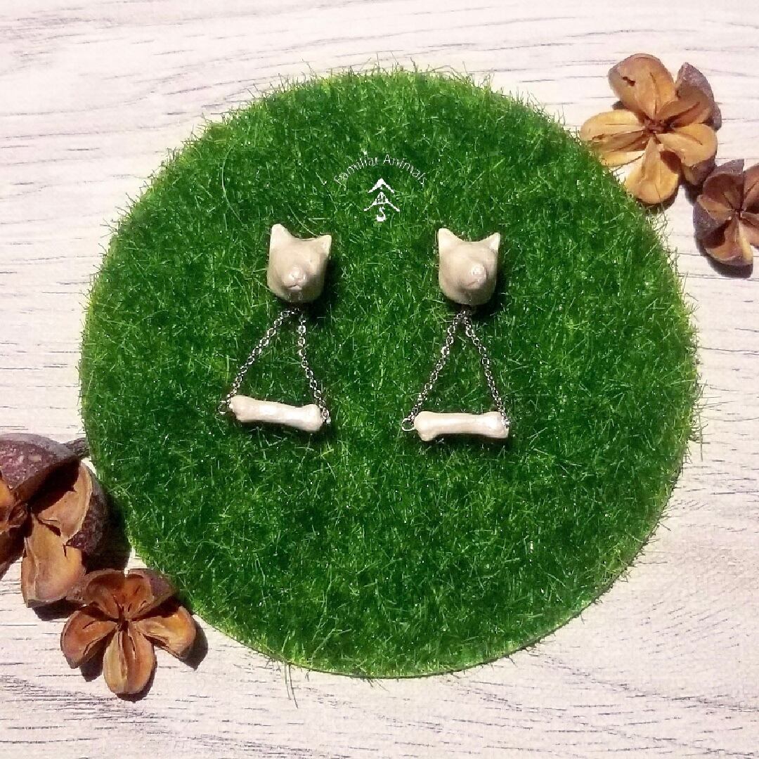 昔一緒に住んでいた犬のハチが、よくほねの形をしたおやつを大事そうに犬小屋の近くに埋めていたのを思い出し、そのイメージでほねと一緒にピアス/イヤリングにしてみました。